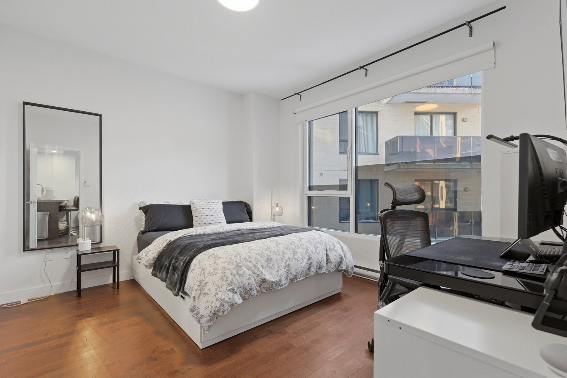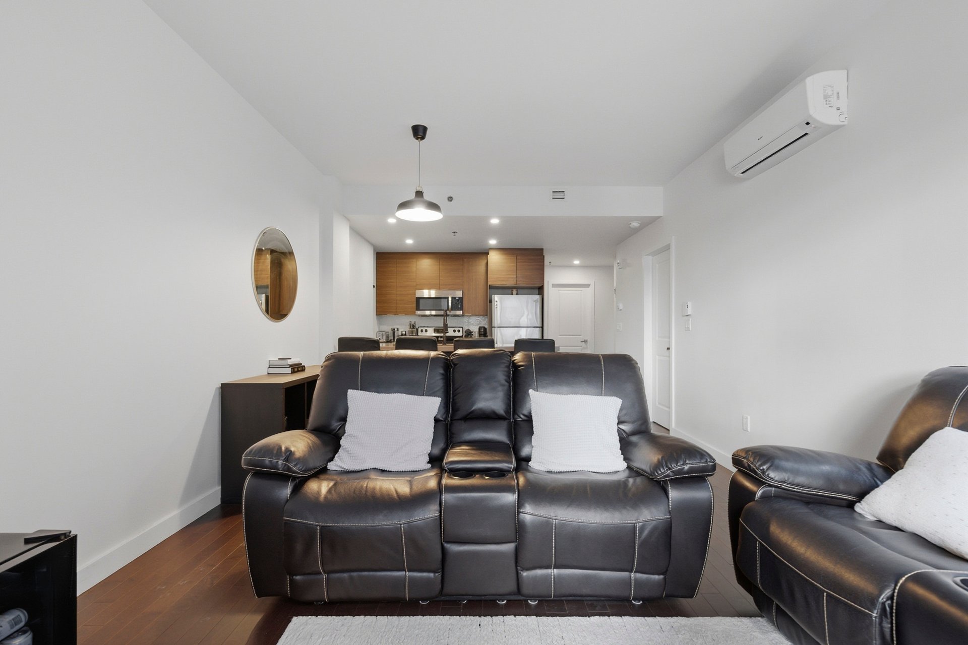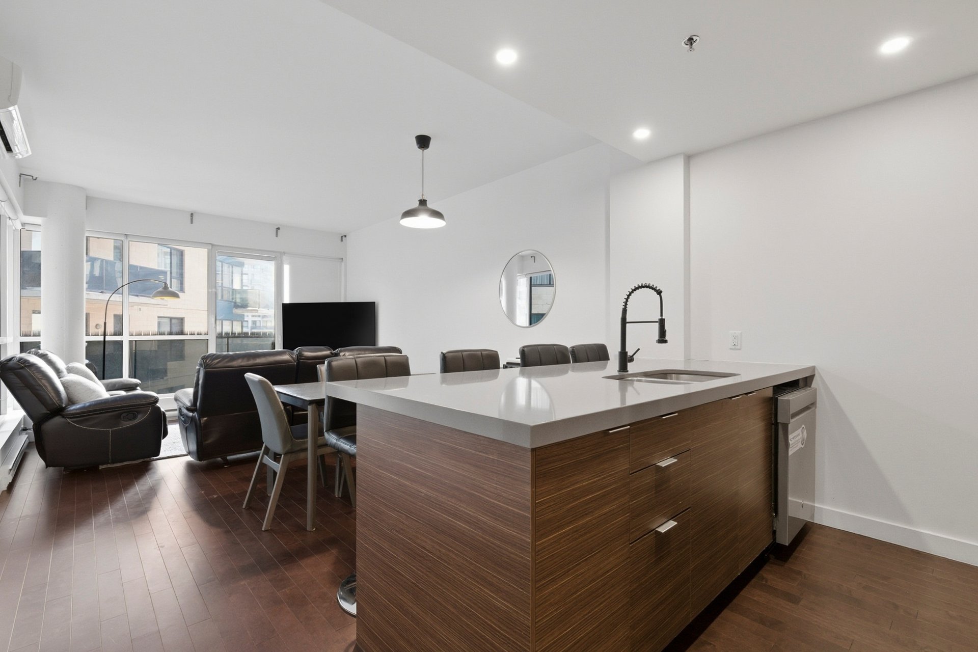Bright and modern condo in Côte-des-Neiges, Triangle sector. Features 2 spacious bedrooms and 2 bathrooms, including an ensuite in the master. Kitchen with quartz countertops, interior storage, and a parking space included. Enjoy top-notch common areas: spa, jacuzzi, indoor pool, gym, cinema room, and reception hall. Ideally located just steps from Namur metro, Royalmount Mega Center, highways 15 & 40, and all services. Don't miss this opportunity!